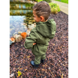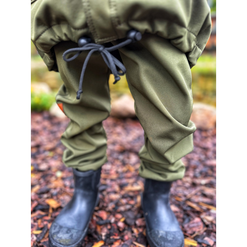 Softshellové kalhoty s nápletem v pase a na konci nohavic s nabíranými koleny. Z rubové strany je hřejivý fleece.
